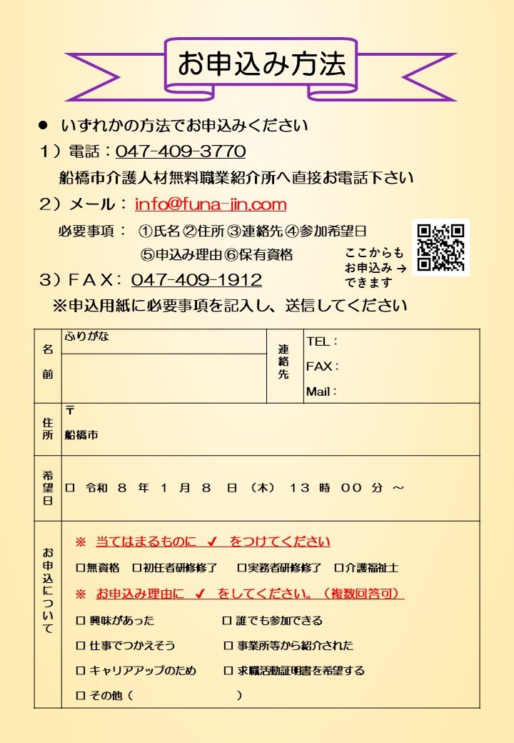 1) 電話:047-409-3770 船橋市介護人材無料職業紹介所へ、直接お電話ください